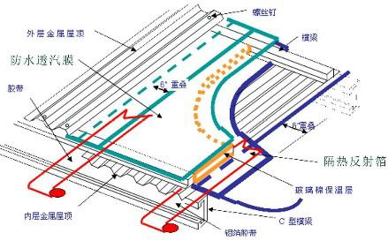 安裝屋面檁條------安裝隔熱墊片------鋪設(shè)ANGSHI隔汽膜或建筑用隔熱膜)------鋪設(shè)保溫棉 ------鋪設(shè)ANGSHI防水透汽膜------固定支架-----安裝上層彩鋼板(鋁板)------安裝下層彩鋼板(鋁板)
