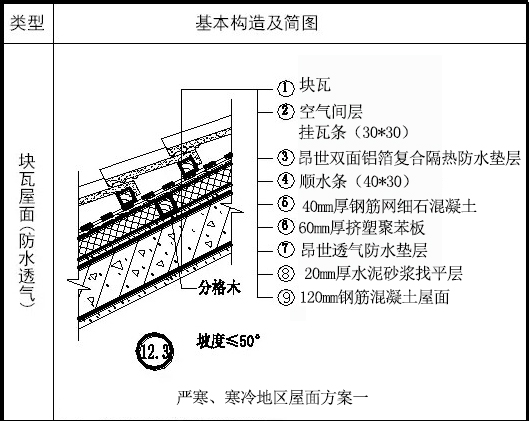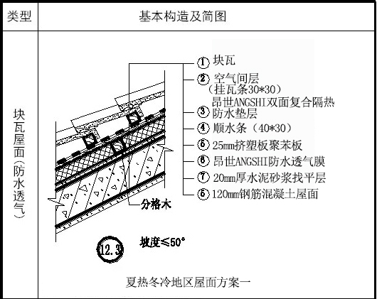 該方案有鋁箔復(fù)合隔熱防水墊層和透汽防水墊層兩道防水設(shè)防,塊瓦輔助防水。防水透汽層起到加強(qiáng)建筑氣密性,水密性的作用,并使屋面內(nèi)部水汽可以順利排出,有效解決防潮問(wèn)題;鋁箔復(fù)合隔熱防水墊層還可起到保溫隔熱的效果。