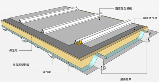 該方案壓型鋼板上面設(shè)置隔汽膜或者鋁箔復(fù)合隔熱防水墊層阻擋雨水侵入墻體結(jié)構(gòu),夏天室內(nèi)集中制冷時(shí),有效阻隔戶外高溫高壓的水蒸氣滲入結(jié)構(gòu)而形成結(jié)露,保溫層外側(cè)設(shè)置透汽防水墊層可起到加強(qiáng)建筑氣密性,水密性的作用,并使屋面內(nèi)部水汽可以順利排出,有效解決防潮問(wèn)題,保護(hù)保溫層的熱工性能。